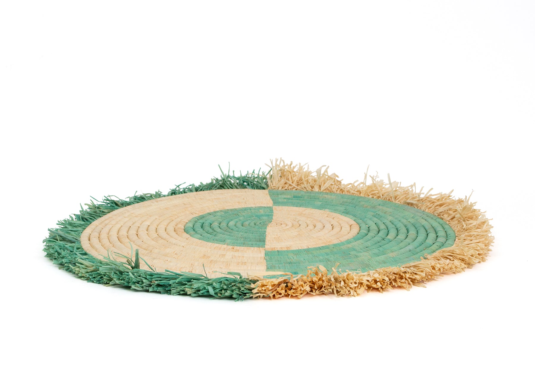 Intricately crafted with timeless tradition, this carefully dyed raffia fiber and sweet grass fringed wall disc is a stunning statement piece.