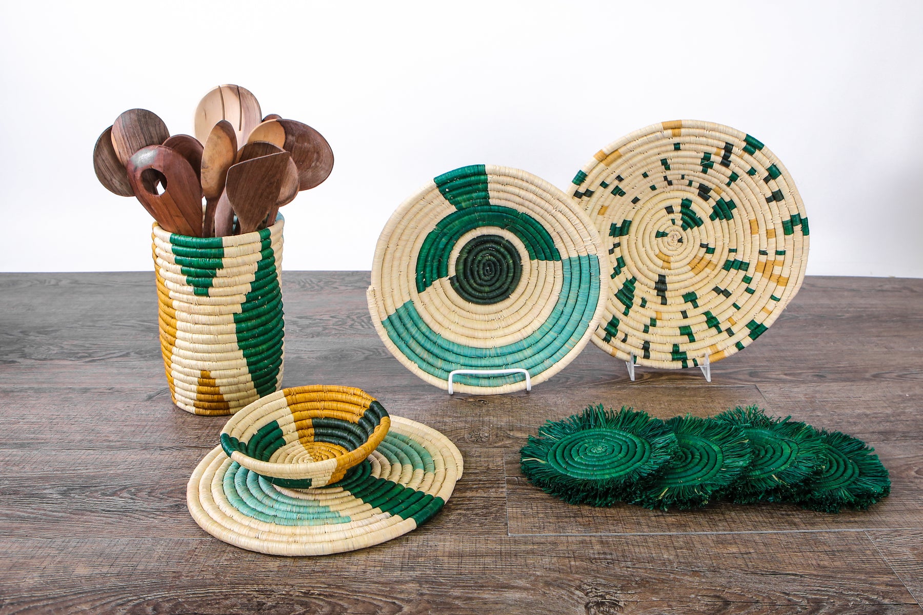 Raffia is harvested by extracting liquid from the raffia palm tree. At first, raffia is green but It is then stripped and dried by the brilliant rays of Uganda sunshine and turns into a beige color. Once fully dried, the KAZI team carefully dyes the dried strands to match Pantone colors. After, the material is distributed to the weavers who take the materials to their homes where they weave your beautiful home decor products.