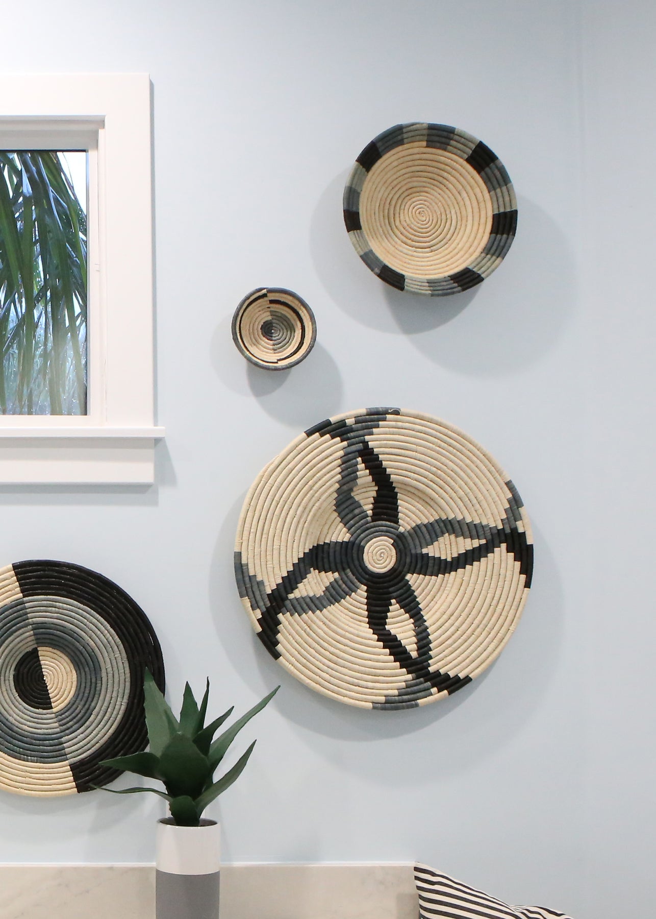 These perfectly sized round baskets are not just gorgeous wall art but functional home decorations. The possibilities are endless. Style it on a shelf for additional storage in your home office, add it to your coffee table for a globally inspired feel, or use it as a serving bowl for your favorite fruit. This fruit bowl is also great storage for keys and mail on your entryway furniture. Most commonly, this woven basket is exquisite, ready to hang wall art with a hand-stitched loop on the back.